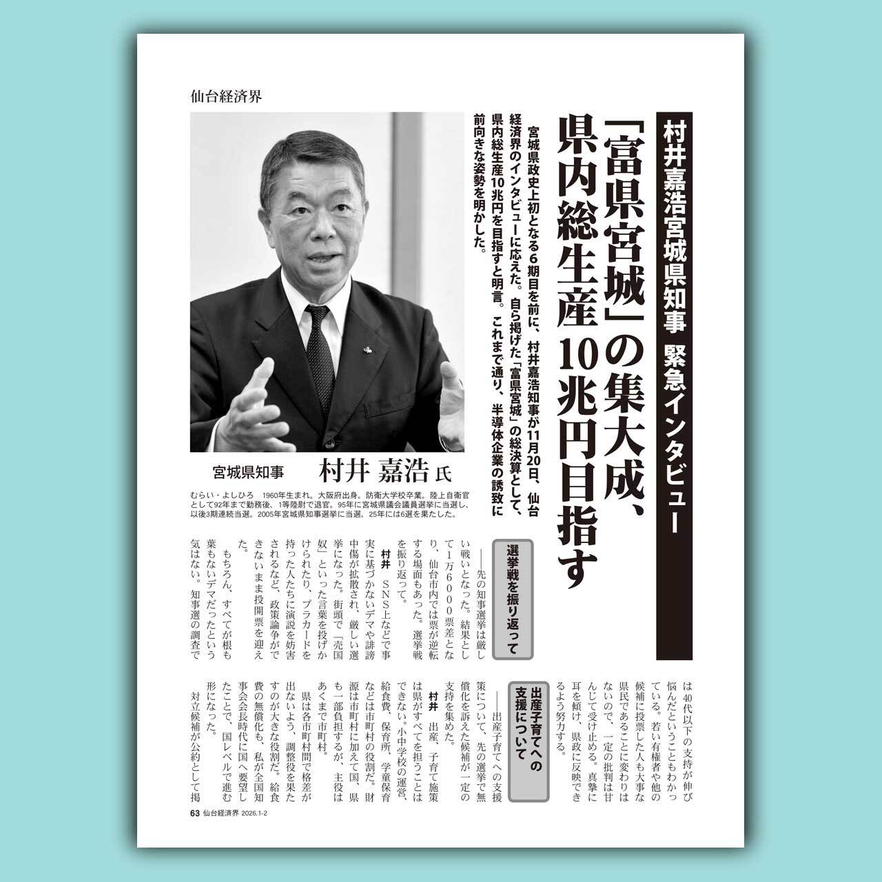 宮城県政史上初となる6期目を前に、村井嘉浩知事が11月20日、仙台経済界のインタビューに応えた。自ら掲げた「富県宮城」の総決算として、県内総生産10兆円を目指すと明言。これまで通り、半導体企業の誘致に前向きな姿勢を明かした。