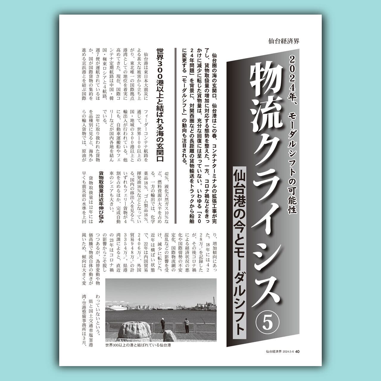 仙台圏の海の玄関口、仙台港はこの春、コンテナターミナルの拡張工事が完了し、貨物取扱量の増加に対応する態勢を整えた。一方、コロナ禍などをきっかけに減少に転じた貨物量は、充分な回復には至っていない。いわゆる「2024年問題」を背景に、対関西圏などの長距離の貨物輸送をトラックから船舶に変更する「モーダルシフト」の動向も注目される。