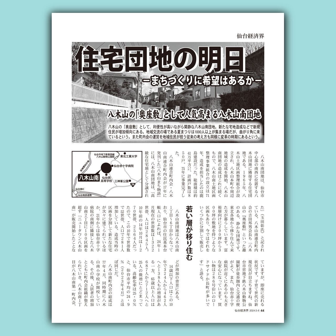 八木山の「奥座敷」として、利便性が高いながら閑静な八木山南団地。新たな宅地造成などで新規住民が増加傾向にある。地域交流の場である夏まつりは1000人以上が集まる場だが、曲がり角に来ているという。また町内会の運営を地域住民が担う従来の考え方も同様に変革の時期にあるという。